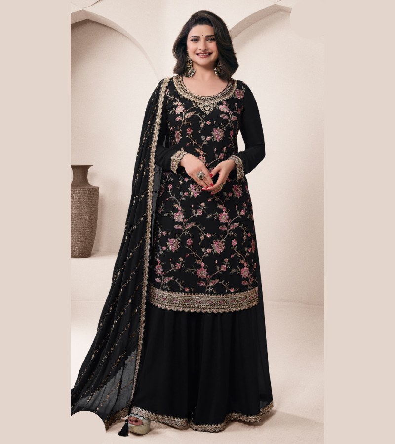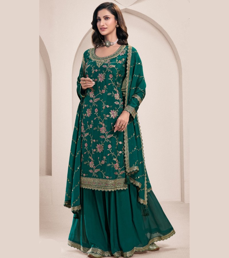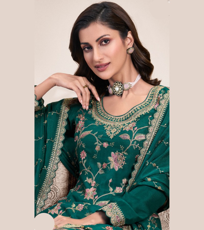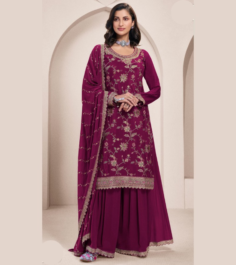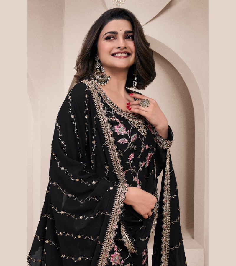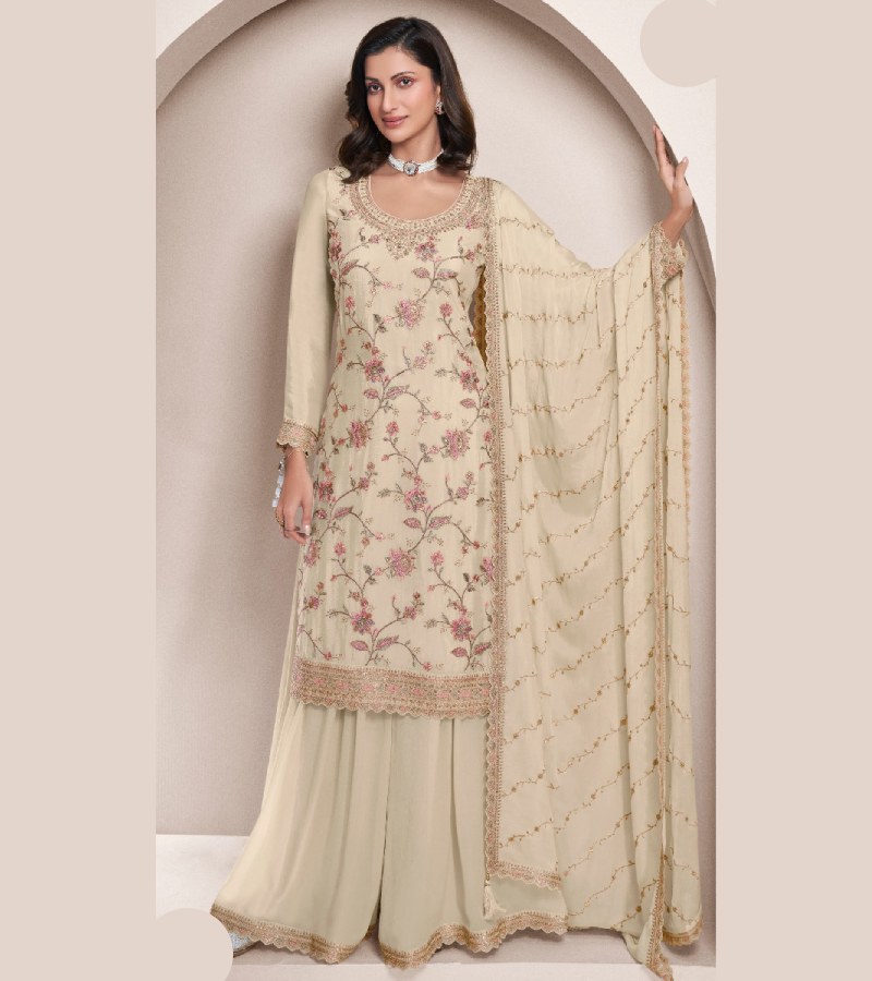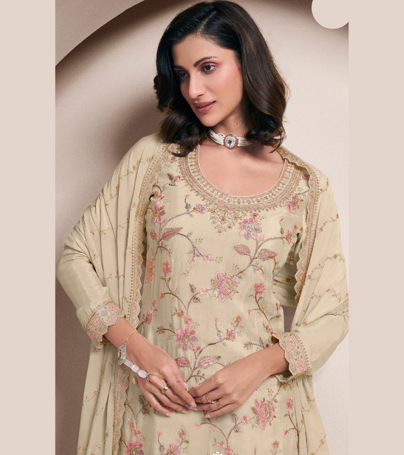 | TOP : DESIGNER MULTI THREAD EMBROIDERED CHINON,BOTTOM : DESIGNER THREAD EMBROIDERED CHINON SARARA,DUPATTA : DESIGNER MULTI THREAD EMBROIDERED CHINON |